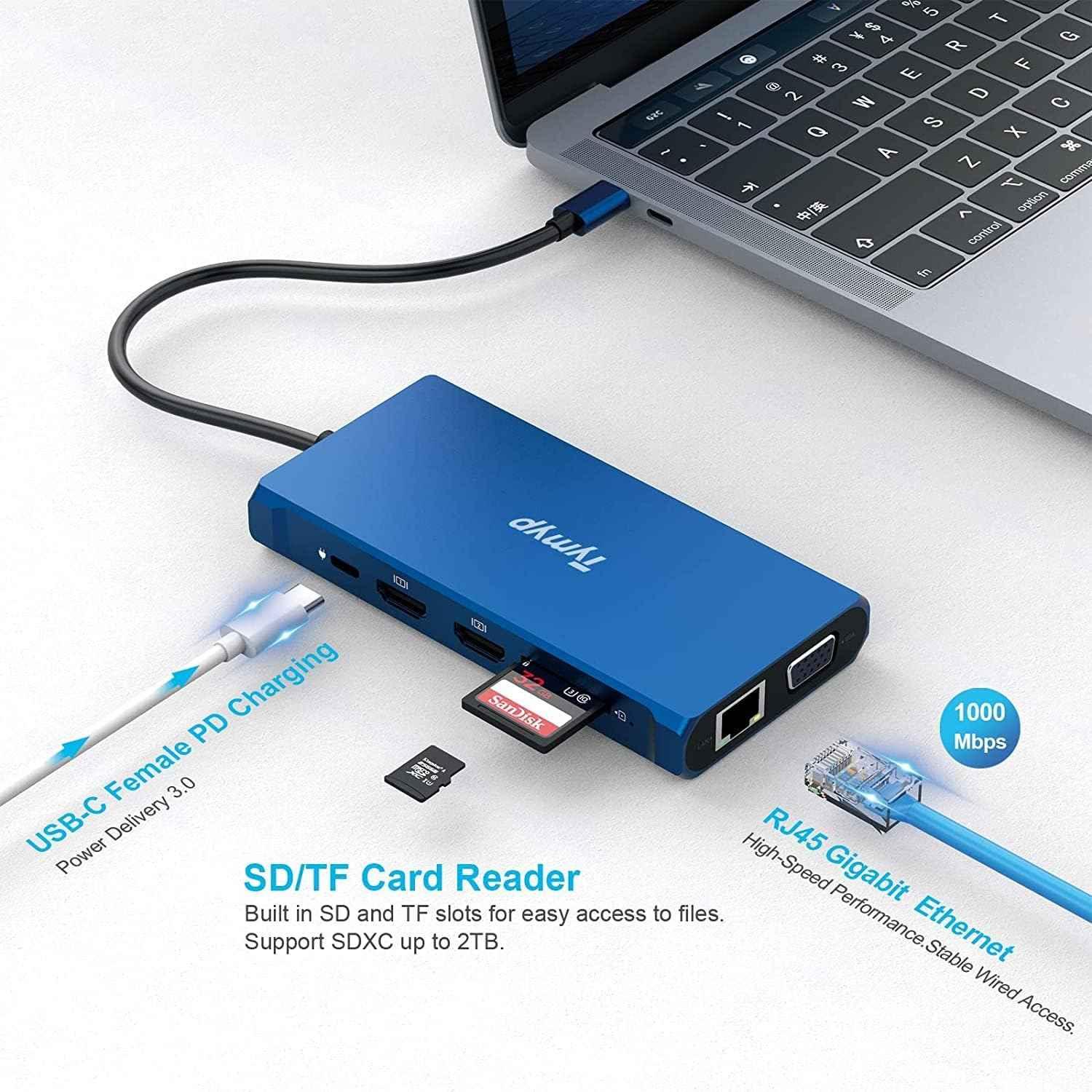 - 12-in-1 USB C Docking Station: USB C laptop docking station works perfectly with the type C laptop devices with the multiport USB C adapter, including: dual 4K HDMI & 1 x VGA, 2 x USB 3.0 ports & 2 x USB 2.0 ports, 1 x USB-C 3.0 ports, 1 x Gigabit Ethernet LAN, 1 x Type C power delivery ports and 1 ports * SD/TF Card Reader