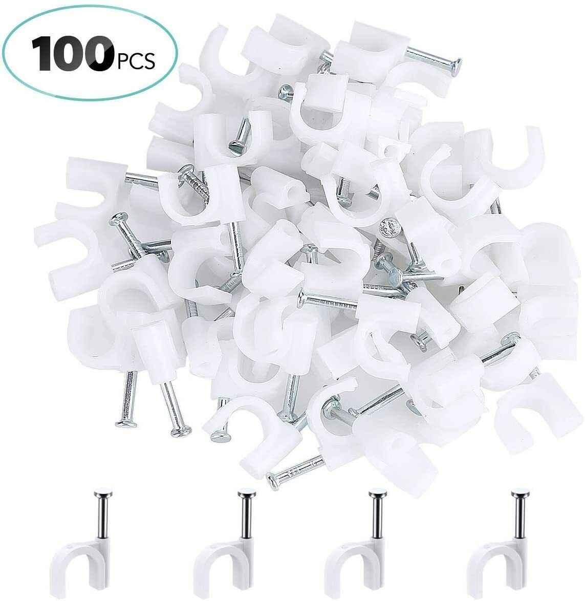 100 Pcs Round Cable Clips White Cable Management – 8mm, AGPTEK Cable Nail Clips Electrical Cable Wall Clips for Wire Ethernet Cable, Telephone Cable, TV Wire PREMIUM-QUALITY MATERIALS AGPTEK cable clips are made of premium PE stabilized plastic and Zinc-plated steel nails, featuring outstanding insulation, corrosion resistance, ageing resistance and impact resistance. SAFE & RELIABLE These cable clips prevent tripping hazards for kids or pets. Secure single or more round electrical cords of small appliances and electronics less than 8mm, effectively avoid accidental disconnection and provide a clean and neat installation. SIMPLE INSTALLATION Easy to install. Just use a hammer (NOT INCLUDED) to nail the cable to the desired place, the clips will hold perfectly around the cables in place and will not falling off. WIDE VARIETY OF USES Suitable for any cables at home, office, internet cafe, KTV, etc. Organize and route your messy cables, such as string lights cable, USB cable, TV wire, VGA cable, etc. Not only can it keep your place tidy and organized, but also help you save time and improve the quality of life. COMPACT SIZE White round profile and small size (0.47*0.31*0.75inch), simple and stylish, makes it not easy to notice even if it is used in the wall of living room. A pack with 100 pcs cable clips, enough to organize many cables of home or office.Features:Outstanding Cable Clips. Made of sturdy and durable PE material, the cable clips can hold up cables well. It isn’t flimsy and won’t be easy to be snapped. The anti-corrosive Zinc-plated steel nails are easy going into Wood, Cement, Plaster, or Brick without bending. Fantastic Solution. Organize any cables with 8mm or less in diameter, such as network cables, computer cables, TV cable, string lights cables, USB cables etc. Wide Applications. Great solution for routing cables. It is handy and perfect for cable wire management for indoors and outdoors! Organized & Decorative. Not only can White Round Cable Clips help those cluttered cords on the floor much cleaner and safer, but also it is helpful to decorate your house. Just free your imagination and have a try. These little cable clips also can make your house more beautiful.Perfect Size & Easy to UseOur cable clips are so small that they are not easy to be found even though they are used to fix LED string light.Just use a hammer to fix the cable to anywhere you need to manage cable. In a moment, the messy cable will get a cleaner look. Also, it can prevent you from tripping the loose cables, keeping your kids or pets safe. Warning:Small parts, please keep away from children.Please turn off the power before installing the clips.Specifications:Colour: whiteMaterial: PE + Zinc-plated steel nailItem Size: 12*8*19mm/0.47*0.31*0.75inchPackage Contents:100 * Round Cable Wire Clips