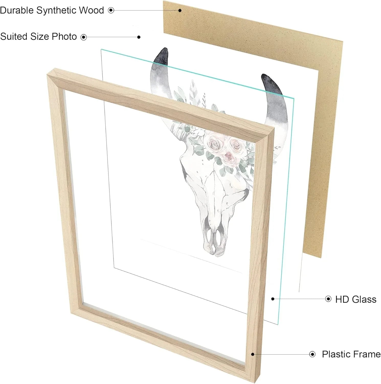 By applying 12x16 picture frame in light-wood color frame with feather, skull and dreamcatcher, this artwork brings a BOHO chic view to your home.
