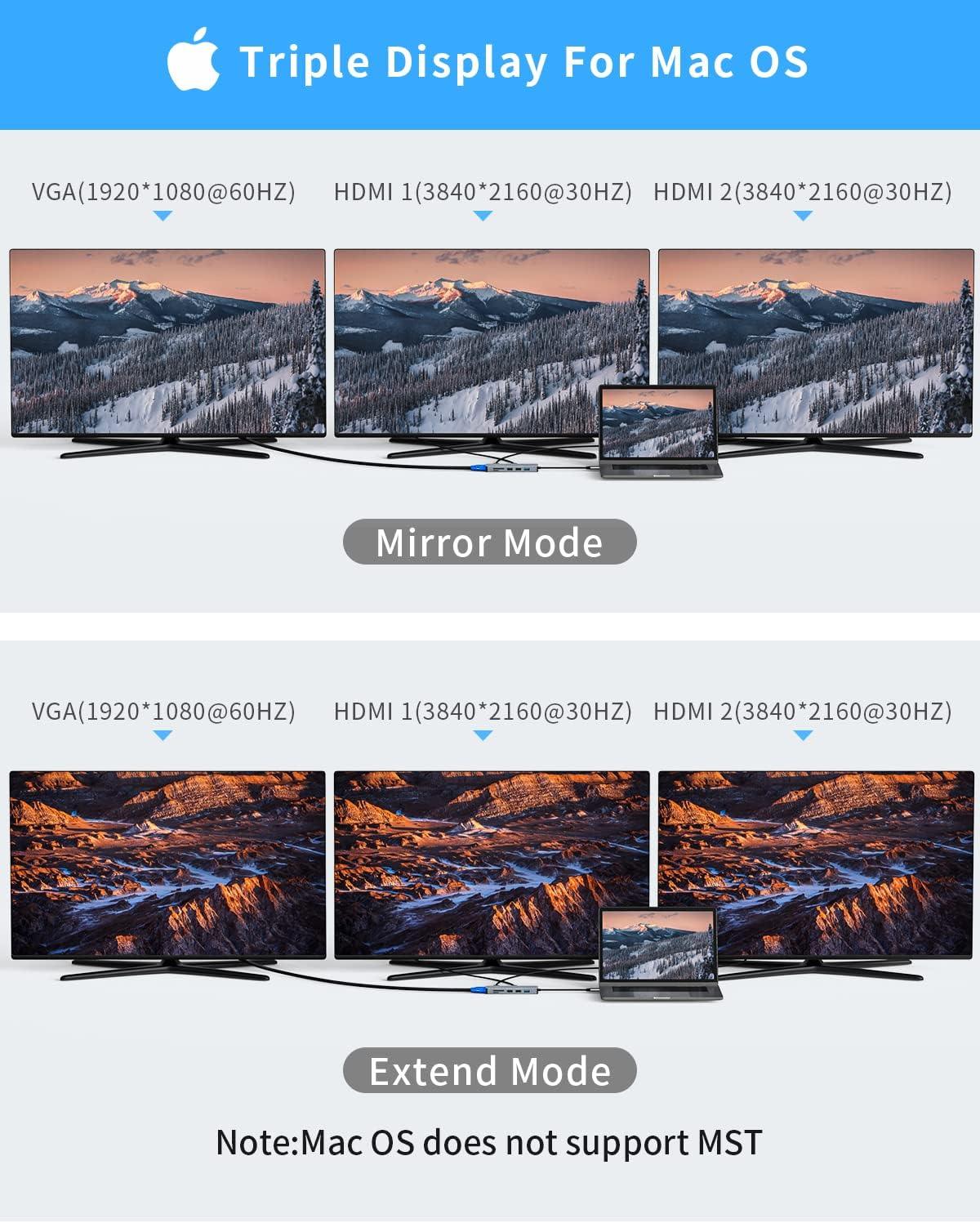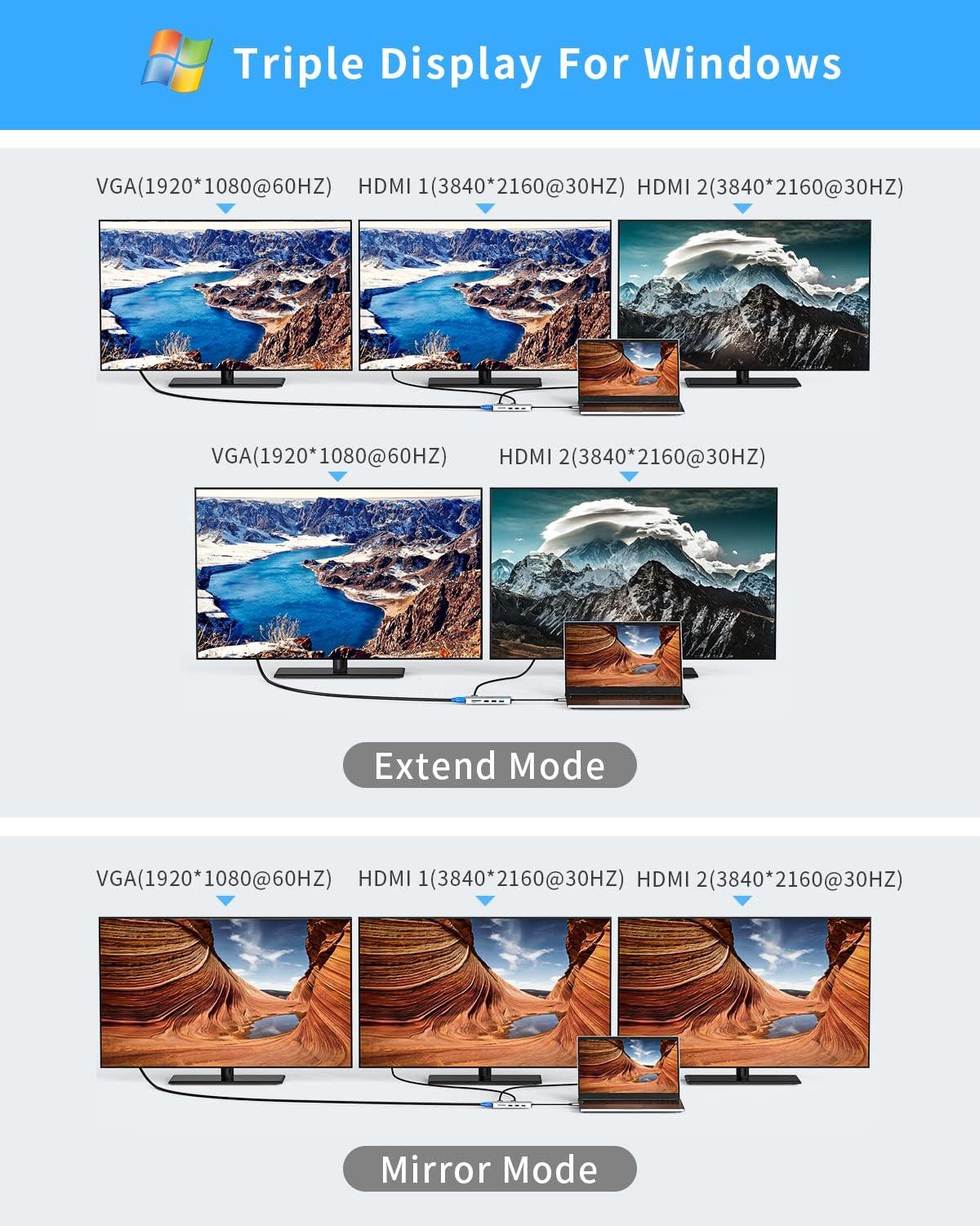 Advanced Triple Display: Enjoy stunning visuals with 2 x 4K@30Hz HDMI and 1 x 1080P@60Hz VGA outputs for seamless multitasking.