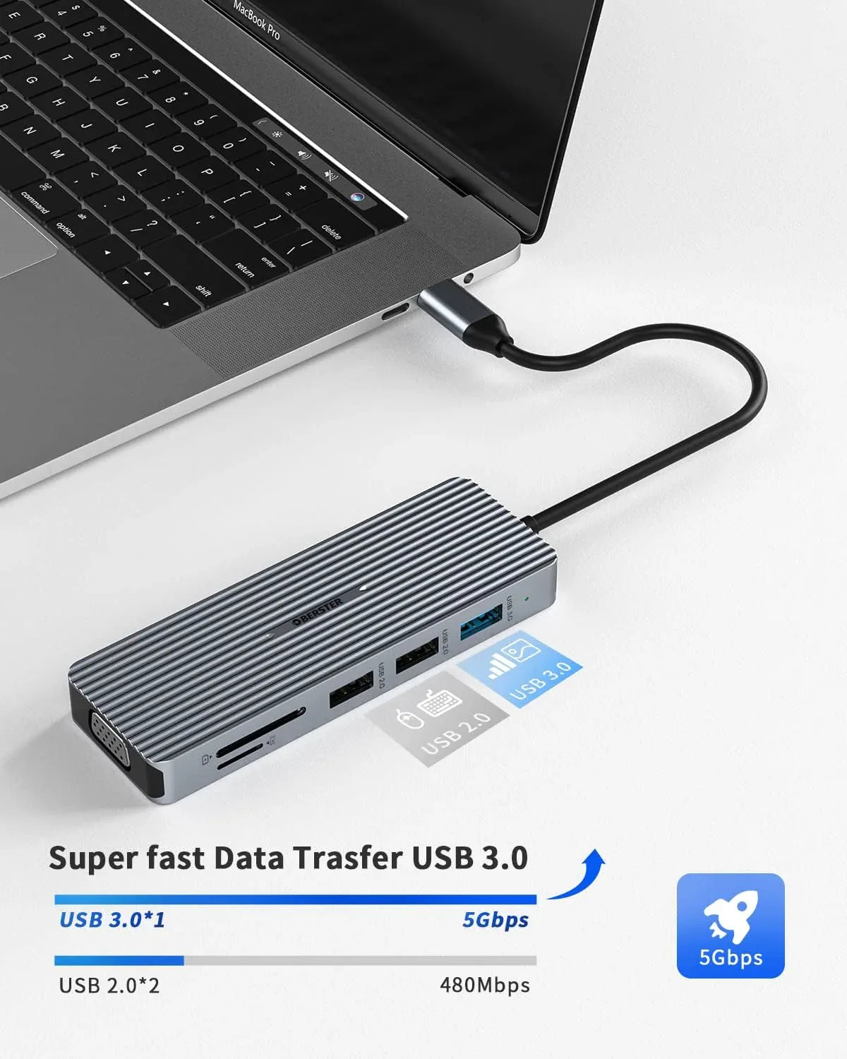 100W Power Delivery: Charge your laptop quickly while using all hub functions—no more low-battery worries!